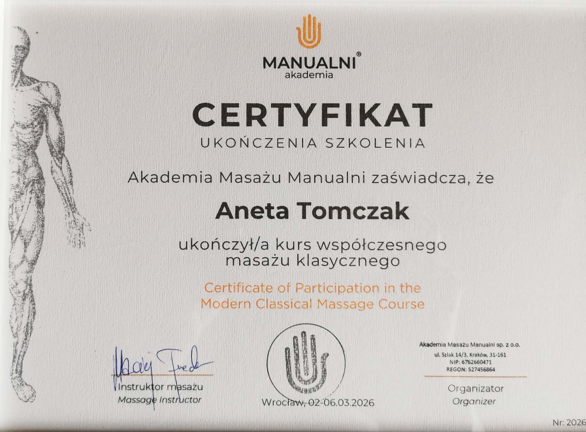 Ukończyłam szkolenia z zakresu masażu Kobido, Kobido Up, szkolenie z face Modelingu, jak również przeszłam szkolenia z masażu transbukalnego zdobywając certyfikat Masterclass(klasa mistrzowska). Stale poszerzam swoją wiedzę i podnoszę kwalifikacje uczestnicząc w różnych specjalistycznych kursach i szkoleniach. Zabiegi, które wykonuję ze szczególną starannością dają widoczne i długotrwałe efekty.