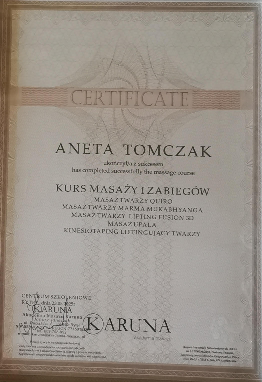 Ukończyłam szkolenia z zakresu masażu Kobido, Kobido Up, szkolenie z face Modelingu, jak również przeszłam szkolenia z masażu transbukalnego zdobywając certyfikat Masterclass(klasa mistrzowska). Stale poszerzam swoją wiedzę i podnoszę kwalifikacje uczestnicząc w różnych specjalistycznych kursach i szkoleniach. Zabiegi, które wykonuję ze szczególną starannością dają widoczne i długotrwałe efekty.